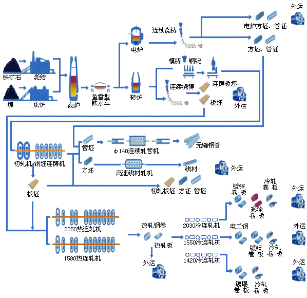 煉鐵的主要原料鐵礦石、焦炭和煤通過高爐中一系列反應變為鐵水,鐵水和廢鋼通過轉爐加工為鋼水。 鋼水可通過連鑄加工成板坯,也可通過模鑄加工成鋼錠后在初軋廠最終加工成板坯、初軋方坯和管坯。由于連鑄避免了模鑄的過程,使得鋼的構成更為均勻,成品率和質量也大幅提高。1999年, 寶鋼的連鑄比約為73%。今后計劃將連鑄比例再提高到100%。 鋼錠、板坯、初軋方坯和管坯為半成品,除一小部分直接銷往市場外,大部分將通過下道軋鋼工序制成成品。板坯、初軋方坯和管坯分別是制成熱軋產品、鋼絲和鋼筋及管材的原料,最終將制成不同品級和用途的熱軋板卷、線材和無縫鋼管。 熱軋板卷部分作為成品銷售;部分作為冷軋的原料,經過酸洗、軋鋼、退火、涂層和油漆,制成具有高附加值的冷軋板卷,包括電鍍鋅板卷、熱鍍鋅板卷和彩涂板卷。