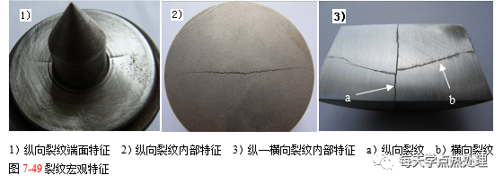 1)短圓柱型 常為縱向裂開,當高度為直徑的兩倍左右時,有橫斷現(xiàn)象。多見于碳素工具鋼,這些零件中心往往存在網(wǎng)狀滲碳體,降低鋼的強度并沿其擴展。
