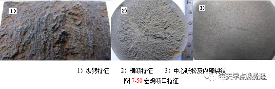 從以上特征可以推斷,頂尖開裂主裂紋是縱向且起裂于工件中心,說明工件心部顯微組織或原材料存在著缺陷。橫截面斷口熱酸蝕后,參照GB1979-80宏觀低倍缺陷評定為中心疏松2級。橫斷背面中心的裂紋,應為未露出表面的縱裂,如圖7-50(3)所示。