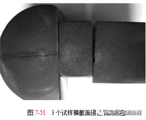 對3個破損頂尖解剖并制備試樣,宏觀可以看到中心有不同大小的灰白色區(qū)域,如圖7-51所示。