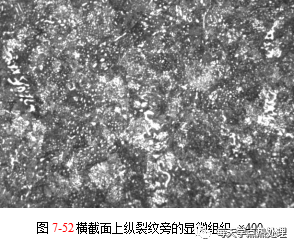 橫截面上縱裂紋末梢沿網(wǎng)狀碳化物擴展,周圍的晶粒特別粗大,斷續(xù)網(wǎng)狀碳化物顯示了晶粒的大小,在顯微鏡100×下裂紋兩側晶粒度評為1.5級;500倍下和標準圖譜進行比較,網(wǎng)狀碳化物評定為3級,如圖7-53所示。