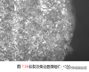 根據(jù)GB1298-86《碳素工具鋼技術條件》“截面≤60mm的碳素工具鋼以不大于2級網(wǎng)狀為合格”,顯然頂尖中心的網(wǎng)狀碳化物已不符合標準。縱截面上的碳化物有帶狀特征,塑性夾雜物沿帶狀分布,縱向裂紋和帶狀方向相同,如圖7-54所示。