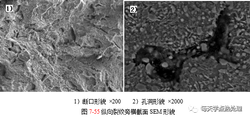 (4)掃描電鏡分析 通過掃描電鏡對縱、橫截面進行檢驗,源區(qū)斷口具有準解理特征,孔洞有可能是疏松,也有可能是熱酸蝕時非金屬夾雜物脫落所形成并沿晶界分布,如圖7-55所示。