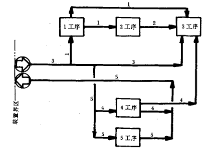1、由一個工序的設備或管道到另一工序(或幾個工序)的設備或管道的工藝管道按起點工序編號,并一直有效到另一工序的設備或管道連接終止,如圖5-10所示。
