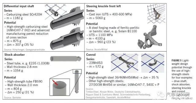 鍛造和輕量化當人們想到鍛造時,輕量化并不是一個立刻浮現在腦海中的詞。然而,鍛造技術被證明是一種經濟有效的方法,可以在汽車應用中實現輕量化的設計進步,從而適合大批量生產。通過利用鍛造技術提供的潛力。在當前的“輕型鍛造計劃”研究項目中展示了在雙橋(splitaxle,分段式驅動橋)混合動力汽車(HybridElectric Vehicle,HEV)和重型卡車子系統中輕量化設計的潛力。項目和評估車輛(圖1顯示了項目詳細信息和技術車輛數據:研究項目共提出了733個混合動力汽車輕量化設計構思和251個卡車輕量化構思。)圖1輕量化設計潛力概述混合動力汽車:作為研究的一部分,考慮了混合動力汽車中總重量為816千克的零部件–大約相當于參考汽車的51%。分析了來自混合動力汽車的動力總成、底盤和電子設備的3600多個comCOVER組件,總共開發了733種輕量化設計思想。然后根據輕量級設計潛力、制造工作和市場實施工作的標準對這些想法進行權衡和分類。這樣就可以根據輕量化設計的成本效益比來評估相關的設計想法,如圖2所示。總的來說,該研究確定了混合動力汽車93千克的輕量化設計潛力,這相當于所分析部件質量的大約11%。然后,根據潛在的重量節省和實施努力,這些想法可以被分類為速效方案、平衡和較難實施的三類,具體取決于潛在的重量減輕和實施工作。圖2商用車:對于商用車動力總成而言,在設計基準測試期間共分析了460個組件,總重量為909kg。在該總重量中,290千克來自傳動裝置,而619千克來自傳動軸和后軸。基于技術可能性,開發了250多個輕型設計思想。最終的輕量化設計潛力總計達到124千克,大約是所分析組件質量的14%。這些想法可以歸類為通過材料、設計或生產概念實現的輕量化設計。但是,這些概念并不是完全獨立的,有時它們是相互依賴的圖3采用材料創新的輕量化設計現代的高強度鋼可以為減輕單個零件的重量,從而減輕車輛的總重量做出重要且具有成本效益的貢獻。倡議的鋼鐵制造商和鍛造公司提議使用大約20種不同的高強度鋼,以實現輕量化,更精簡的零部件設計。這些鋼具有廣泛的成分,金相組織和性能范圍。建議的一些沉淀硬化鐵素體-珠光體(彌散硬化鋼,DHS)和調質(Q+ T)高強度鋼,以及在鍛件冷卻后具有貝氏體組織的鋼在圖4的材料譜中顯示了這些材料的鍛造溫度、以及它們的強度和延展性。圖4Saarstahl,Sidenor和Georgsmarien-hütte建議連桿,曲軸和輪架使用高強度彌散硬化鋼,例如38MnVS6和46MnVS6,它們通過鍛造熱的冷卻控制而達到機械性能,而無需額外的熱處理工藝。在某些情況下,這種彌散硬化鋼的強度可能會超過傳統的調質鋼的強度,例如42CrMo4。圖5高強度貝氏體鋼有時會通過鍛造熱的受控冷卻獲得更高的強度,同時改善延展性。圖4顯示了幾種貝氏體鋼。在圖5提出了幾種用于具體應用的貝氏體。圖5中的百分比表示與輕量化設計方案相比,系列零件的重量增加了多少。鐵姆肯鋼公司(TimkenSteel)展示了具有較高強度的沖擊性能(夏比能量值)的鋼。在如此高的強度下,鋼的清潔度起著至關重要的作用。鐵姆肯鋼鐵公司表示,因此在生產過程中使用了其“超潔凈鈾”技術。彈簧鋼可實現最高的抗拉強度,例如55Cr3,Saarstahl建議的熱機械軋制54SiCrV6、60SiCrV7或ArcelorMittal展示的SolamM2050 S-Cor,強度可達2050MPa。這種鋼可以減輕諸如橫桿或彈簧之類的車輛部件的重量。通過使用高強度鋼實現的重量減輕不僅在鍛件的情況下是可能的。使用可以承受更高載荷的鍛鋼也可以替代鑄件。因此,德國DeutscheEdelstahlwerke建議使用不銹鋼,耐磨、高碳濃縮和氮合金鋼來代替重35.5千克的鑄造卡車制動盤。在此應用中,Sidenor在使用耐磨的錳合金鋼1.3401(X120Mn12)時發現了輕量化的設計潛力。在圖5(左上方)中,介紹了在分析的混合動力SUV中應用的差速器輸入軸的輕量化設計潛力。該空心軸目前由一種稱為SCr420H的CrMn滲碳鋼制成,重量為1182g。作為此類CrMn滲碳鋼的高強度替代品,Georgsmarienhütte與Hirschvogel合作開發了一種微合金化貝氏體鋼,稱為16MnCrV7-7(1.8195)。該鋼還可以進行表面硬化處理,并在高達1050°C的滲碳溫度下保持穩定的細晶粒結構。其特征還在于更高的淬透性值。這種用于差速器輸入軸的高強度鋼可實現優化的薄壁設計,從而有望減輕307g的重量。在該計劃中進行的分析還表明,對于管件(例如在減震器中組裝的管件),可以實現可觀的重量減輕。因此,本特勒建議用屈服強度為500-600兆帕的高強度鐵素體-貝氏體多相鋼FB590替換屈服強度至少為235MPa的E235+ CR鋼制成的管件。這樣,外管的壁厚可以從2.8毫米減小到2.0毫米,從而實現250g的相應輕量化減重(圖5左下)。安賽樂米塔爾(ArcelorMittal)建議使用鐵素體-珍珠巖鋼或其貝氏體鋼SolamB1100作為鑄造材料的輕質替代品,例如用于轉向節。通過在零件上進行的有限元模擬,可以估算出所減輕的重量。通過使用貝氏體鍛鋼,可以實現4100克重量的鑄件替換原先的5060克鑄件——只需通過鍛造熱控制冷卻,而無需進行昂貴的熱處理工藝。鋼鐵制造商Sidenor建議使用其Micro1100鋼(44MnSiVS6)來減輕圖5(右上方)所示轉向節的重量。通過直接從鍛造熱中冷卻鋼,生成了鐵素體-珠光體晶粒組織,其抗張強度為1100MPa。Sidenor認為這種輕量化設計潛力約為20%。連桿的輕型設計建議由ArcelorMittal,DeutscheEdelstahlwerke,Georgsmarienhütte,NipponSteel,Nis-san,Saarstahl,SchmiedetechnikPletten-be