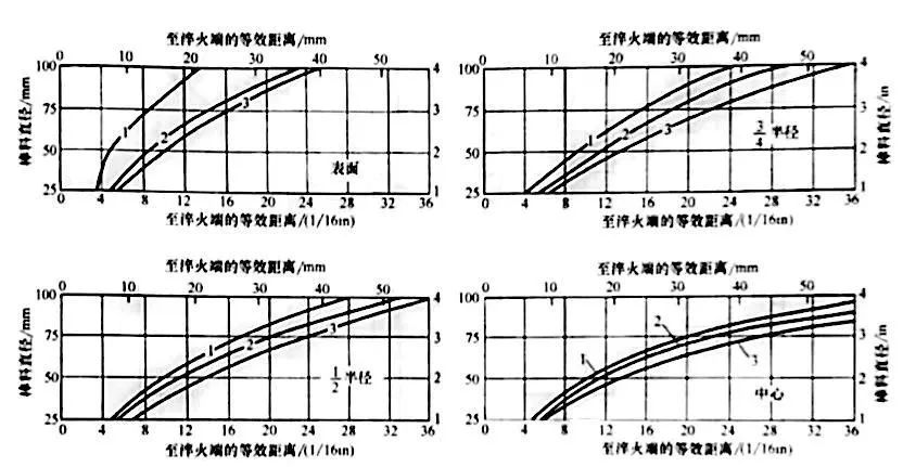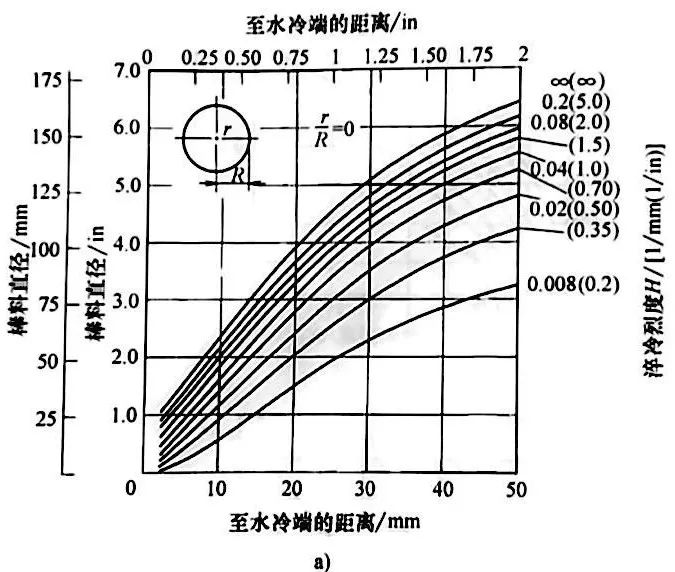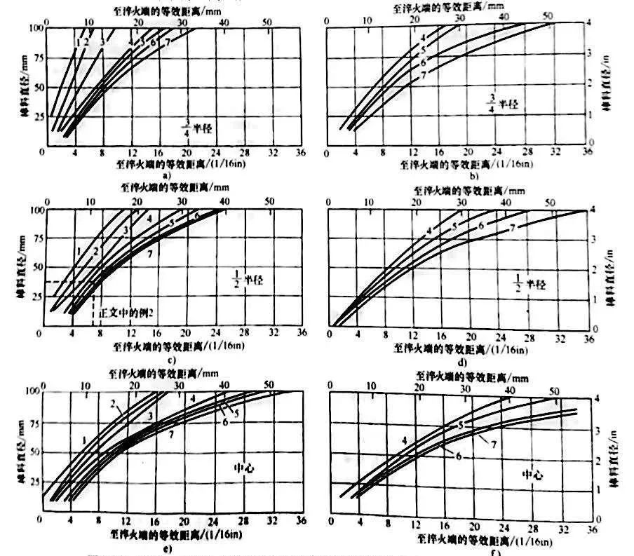 以格羅斯曼圖(上篇 圖15和圖16 c) 為基礎,拉蒙特(Lamont) 利用末端淬火距離(表2)對應等效冷卻速度的基本原理,繪制了各種橫截面的淬硬深度比例對應不同H值的圖。圖20所示,為將不同直徑的圓棒全部淬硬和淬硬到1/2 半徑的實例。