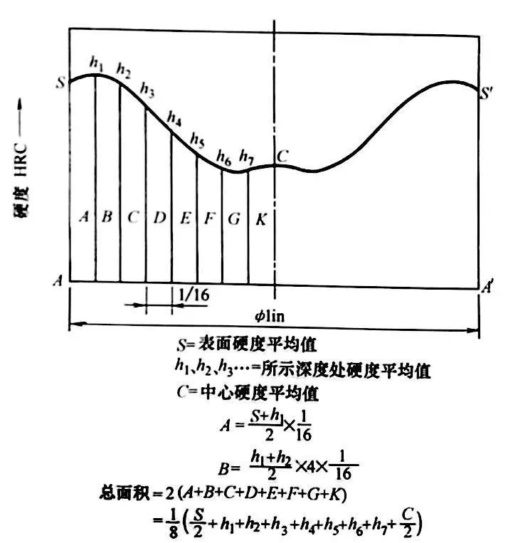 SAC試驗法是將Φ25.4mm(1in)的試棒在空氣中正火,然后加熱至奧氏體水淬。從100mm(4in)的長度處切下一個試樣測量硬度在表面、中心、以及從表面到中心以1.6mm(1/16in)為間距測量硬度。然后根據圖29 中的公式計算區域硬度。