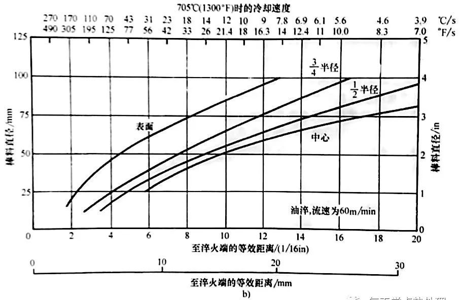▲圖24 從845℃(1550°F)淬火,末端淬火距離與相同半冷溫度的圓棒位置的對應關系