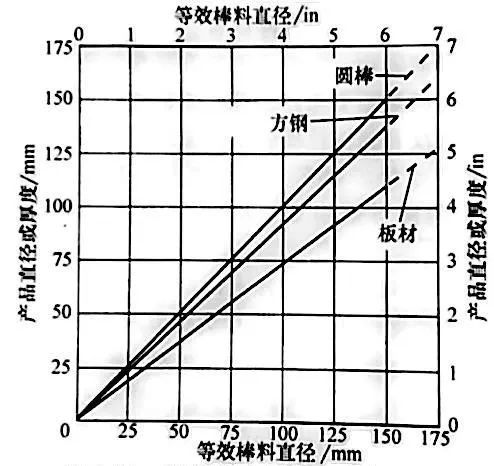 ▲圖37 整體淬火圓棒直徑與整體淬火板材和方鋼之間的關系