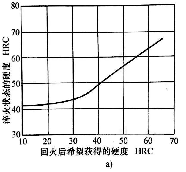 對于一個具體的應用的零件,為了達到要求的硬度,首先需要確定含碳量。預期的淬火硬度是回火后所要求硬度的函數(圖38a)。如圖38b 所示。
