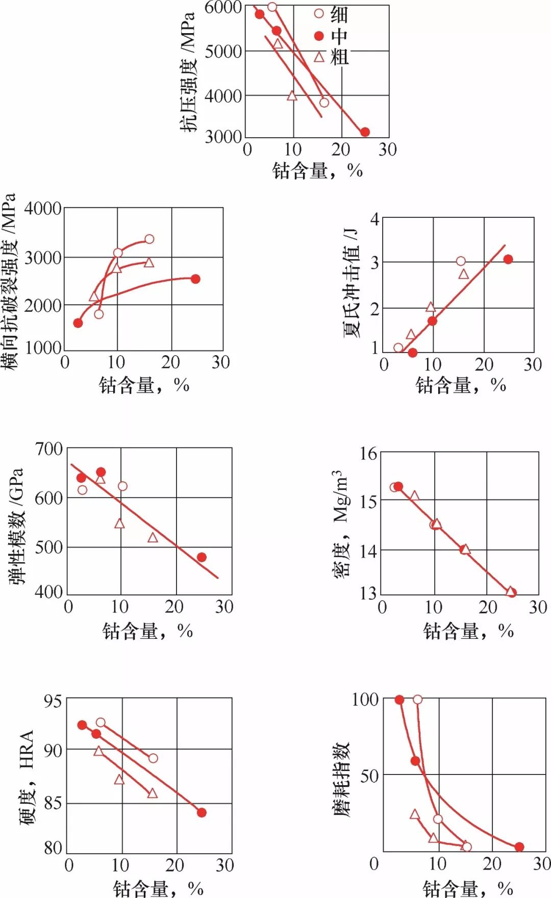 圖4 WC硬質合金的性能隨含Co量和晶粒粗細而變化