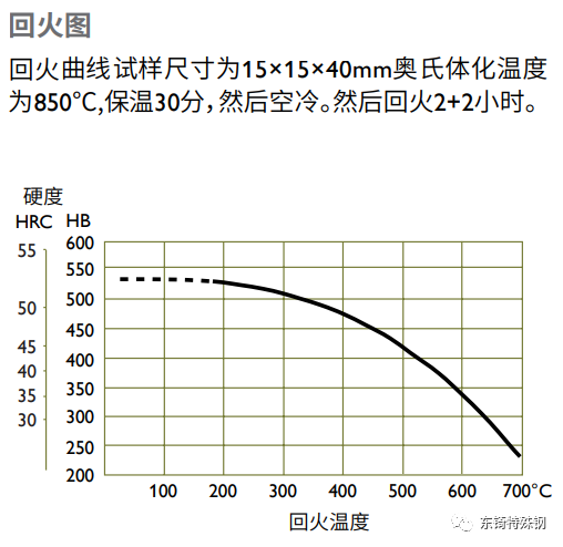 根據所需硬度,參考回火曲線圖選擇適當的回火溫度?;鼗鹬辽賰纱?。每次回火后必須冷卻至室溫,對小模具可180°C回火,但是推薦250°C為最低回火溫度,每次回火至少保溫兩小時。