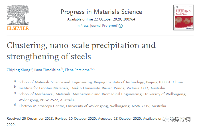 近日,北京理工大學材料科學與工程學院熊志平等人關于鋼的團簇、納米級析出和強化方面發表頂刊綜述IF=31.56,重點介紹在從高強度低合金鋼到馬氏體時效鋼的低溫體心立方相(鐵素體,貝氏體-鐵素體和馬氏體)中的團簇形成和納米析出;提供了關于這些特征的形核與長大的實驗和模型數據;評估了可能的強化機制;最后對這些鋼種的未來研究領域和挑戰進行了深刻的討論。相關研究成果以題“Clustering, nano-scale precipitation and strengthening of steels”發表在材料綜述頂級期刊Progress in Materials Science上。