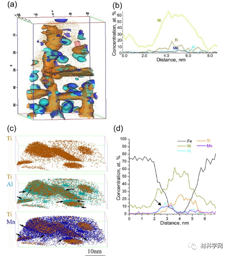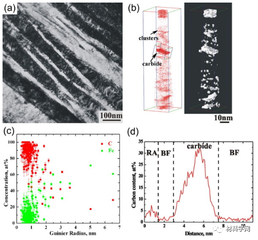 圖2.(a)在熱軋低碳鋼的鐵素體中形成的C-Cr團簇的選定原子圖。(b)C-Mo-Ti團簇和(c)(Ti,Mo)C析出在C-Mo-Ti鋼的鐵素體中。(d)團簇和納米顆粒的溶質濃度與在C-Mo-Ti鋼中形成的Gunier放射性的函數關系。圖5.相間析出的各種形成機制示意圖:(a)產生平面薄片的壁架機制和(b)產生彎曲薄片的準壁架機制;(c)導致纖維相間析出的超邊緣機制(I將碳化物固定在一個單元架上,II-碳化物的生長超過鐵素體的生長,以及III-壁架不會從碳化物上脫開,從而導致纖維狀碳化物的形成);(d)擴展的壁架機制圖6.(a,c)在NPLE(b)和PE(d)條件下,鐵素體/馬氏體(本來是奧氏體)界面上的碳原子圖和(b,d)組成圖圖7.轉變溫度對(a)層間間距和(b)沉淀物數量密度的影響圖9.(a)碳原子圖,顯示了熱軋低碳鋼的鐵素體中的Cottrell氣氛;(b)C,Mo和Nb原子圖顯示了TMP后Nb-Al-Mo鋼的多邊形鐵素體中的細小顆粒,(c)整個細小析出物的代表性濃度曲線。圖11. TEM顯微照片,顯示了貝氏體的形態:(a)顆粒貝氏體[220];(b)針狀鐵素體[220];(c)上貝氏體[221];(d)下貝氏體[220]。PF是多邊形鐵素體,BF是貝氏體鐵素體,M是馬氏體,RA是殘余奧氏體。圖12.位錯系統的3D結構,其在0.63%的應變下具有強的析出物,顯示出錯綜復雜的位錯網絡,嵌入了Orowan環圖13 (a)納米貝氏體的明場TEM圖像,(b)碳原子圖和相應的7.5 at。高爐中簇和碳化物的%C等濃度表面,(c)Fe-C簇和顆粒的溶質濃度隨Guinier半徑的變化,(d)跨Fe-C碳化物的組成分布圖14 Fe-20.1Ni-1.8Mn-1.6Ti-0.59Al(wt。%)合金在823 K時效時的析出演變:(a)3.88 at。%Ti,2.92 at。Mn含量為3.38 at。600 s后出現棒狀和板狀(Fe,Ni)3(Ti,Al,Mn)和球形NiMnAl沉淀的%Al等濃度表面,(b)沿圖中所示方框橫跨板狀顆粒的濃度分布(一種); (c)原子圖顯示Mn和Al在(Fe,Ni)3 Ti析出物中的偏析以及新的(Fe,Ni)3(Mn,Al)析出物的成核