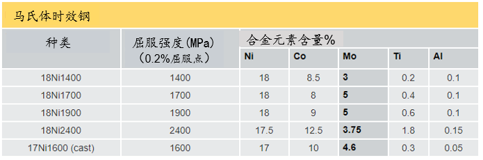 下表是Inco公司在1950年代后期開發的18%鎳-鈷-鉬馬氏體時效鋼的合金成分。