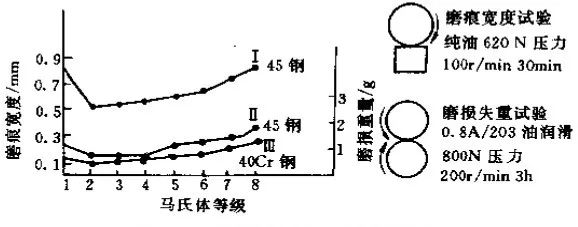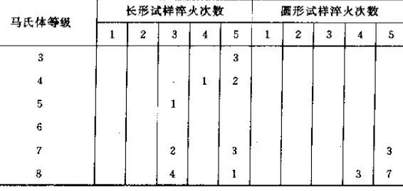 過熱的另一個重要特征是淬火馬氏體粗大,它將降低沖擊韌度和耐磨性,增加淬火變形傾向和淬火開裂傾向,如圖10、圖11、和表7、表8 所示 。中碳鋼馬上按其形態(tài)和尺寸分為8級,7、8級即為過熱組織。