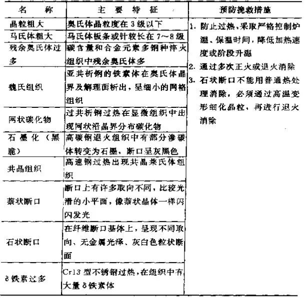 過熱組織包括結(jié)構(gòu)鋼的晶粒粗大,馬氏體粗大、殘余奧氏體過多、魏氏組織,高速鋼的網(wǎng)狀碳化物、共晶組織(萊氏體組織)、萘狀斷口、馬氏體不銹鋼的鐵素體過多、黃銅合金脫鋅使表面出現(xiàn)白灰,酸洗后呈麻面等。