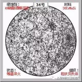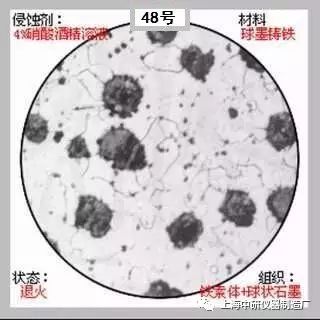 30、W18Cr4V退火-S+碳化物。基體為S,S呈暗黃色,白色塊狀為共晶碳化物,白色細小顆粒為二次碳化物。31、W18Cr4V淬火-M+Ar+碳化物。白色基體為隱針狀淬火M及Ar. 450X。32、W18Cr4V淬火及回火-M+碳化物+A殘。黑色基體為回火M+Ar,白色大塊顆粒為共晶碳化物,細小顆粒為二次碳化物。33、1Cr18Ni9Ti 固溶處理-A。白色晶粒為A晶粒,部分晶粒呈孿晶。34、30CrMnSi 等溫淬火 B粒。由灰白色F和它所包圍的小島狀組織所組成。35、ZGMn13 A+碳化物。白色基體為A,黑色網絡為晶界,沿A晶析出顆粒狀碳化物。36、20鋼 滲碳的平衡組織。最表層為過共析層,黑色基體為P,白色網絡為Fe3Cll。37、40cr 調質+軟氮化 軟氮化組織。白色表層為多相化合物,其結構一般為:Fe4N、Fe3N、CeN的混合組織。比較致密,余為回火索氏體。38、45鋼-滲B組織。表層白色為硼化物Fe2B相,呈現齒形契入基體中。39、灰口鑄鐵 HT的石墨形態。黑色片狀組織為石墨,因未作浸蝕,故基體未顯示,呈白色。40、可鍛鑄鐵-KT的石墨形態。黑色団絮狀組織為石墨,類似棉絮,外形較為規則。41、球墨鑄鐵 QT的石墨形態。黑色的球狀組織為石墨。42、蠕墨鑄鐵的石墨形態。蠕墨鑄鐵的石墨結構處于片狀石墨和球狀石墨之間,其特征石墨的長與厚之比值較小,片厚短,兩端都圓鈍。43、灰口鑄鐵-HT100 F基體灰口鐵。基體F為白色,并顯示黑色網絡晶界,F基體為上分布著黑色的片狀石墨。44、灰口鑄鐵-HT-150 F+P基灰鑄鐵。P呈黑色片狀,F分布于片狀石墨兩側呈白色,片狀石墨為黑灰色。45、灰口鑄鐵-HT-200 P基灰口鐵。灰黑的長片為石墨,基體為灰黑色教習的片狀珠光體。46、可鍛鑄鐵-KT350-10 F基可鍛鑄鐵。基體為F,呈白色,有明顯的黑色F網絡晶界。47、可鍛鑄鐵-KT550-04 P基可鍛鑄鐵。基體P呈黑白相間的層片狀。有的有小量白色F,黑色団絮狀為石墨。48、球墨鑄鐵-QT400-15 F基球墨鑄鐵。白色基體為F,黑色網絡為F晶界,黑色球狀為石墨。49、球墨鑄鐵-QT500-5 F+P基球墨鑄鐵。黑色球狀為石墨,白色F環繞于球狀石墨周圍,成為牛眼狀組織。50、球墨鑄鐵-QT700-2 P基球墨鑄鐵。黑白相間的層片狀為P,灰黑色球狀為石墨。51、高磷鑄鐵 P+片狀石墨+磷共晶. 層片狀基體為P,由于深浸蝕而成黑色;灰黑色為片狀石墨,白色棱角狀為磷共晶。52、ZL102-未變質的鋁硅合金。淺灰色粗大的針狀硅晶體與白色∝固溶體組成共晶組織+少量的淺灰色多邊形的初晶硅晶粒。53、ZL102 已變質的鋁硅合金。白色枝晶狀組織為初生∝固溶體,其余為灰黑色細粒狀硅與白色∝固溶體組成的共晶組織。54、LY12- 白色為∝(AL)基體與深黑色的[∝(AL)+θ相)CuAl2)+S相(Al2CuMg)]三元共晶及[∝(AL)+θ相)CuAl2)]二元共晶。三元、二元共晶均呈網絡分布,難于分辨。55、LY12-硬鋁的時效組織。白色∝(AL)基體上分布黑色θ相(CuAl2)及S相(Alo2CuMg)強化相質點。56、H70-單相黃銅組織。為鋅溶于銅中的∝固溶體等軸晶粒。有的晶粒含有孿晶。57、H62-雙相黃銅組織。白色部分為∝固溶體基體,黑色條塊狀是以電子化合物CuZu為基的β固溶體。58、QSn10-亮白色樹枝狀為錫溶于銅鐘的∝固溶體。∝樹干富銅,外圍較黑處富錫;樹枝間隙處白色中分布很細小的點為(∝+δ)共析體。δ是以電子化合物Cu31Sn8為基的固溶體。59、QSn10-∝固溶體單相組織,晶粒內有滑移帶。60、鎳基軸承合金-∝+β‘+η組織,白色方塊為β’相,放射針狀為η相,基體∝呈黑色。61、鎳基軸承合金∝+(∝Pb)+β)共+Cu2Sb)組織白色方塊為β相(SnSb)硬質點。部分針狀為銅銻化合物(cu2Sb),其余為(∝+(Pb)+β)共晶軟基體。62、45鋼-黑白相見層狀交替排列帶狀組織。白色晶粒為F,黑色塊狀為P。63、ZG30-低碳魏氏體。白色針狀、塊狀為F,黑色為P。64、T13-高碳魏氏體。黑色塊狀為P,白色網絡為Fe3C,Fe3C呈針狀插入、甚至穿透P晶粒。66、鐵基粉末冶金-鐵素體+珠光體+孔隙。白色基體為鐵素體,黑色粗片狀為珠光體,極少量條狀滲碳體,黑色顆粒為孔隙。