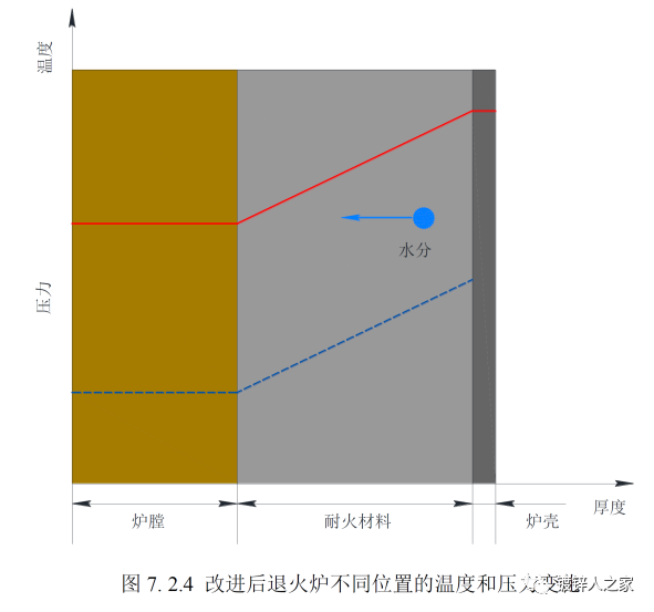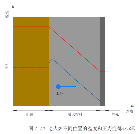 由于退火爐的隔熱材料傳熱很慢,在加熱時(shí)隔熱材料內(nèi)部的溫度梯度很大,比如,即使?fàn)t膛內(nèi)部的氣體被加熱到400℃,隔熱材料內(nèi)側(cè)的溫度也為400℃,但靠近爐殼外側(cè)的溫度也不會(huì)超過(guò)60℃。換而言之,接近內(nèi)側(cè)的隔熱材料中的水已經(jīng)大量蒸發(fā),水蒸氣的壓力很高,而外側(cè)的隔熱材料中的水還沒(méi)有開(kāi)始蒸發(fā),水蒸氣壓力很低,這樣就會(huì)造成隔熱材料內(nèi)側(cè)的水向外側(cè)遷移的現(xiàn)象,但由于退火爐鋼板爐殼的作用,無(wú)法揮發(fā)出去,只能留在耐火材料與鋼板之間,這是與我們烘干隔熱材料所希望的水分由外側(cè)向內(nèi)側(cè)遷移的方向正好相反。正因?yàn)槿绱?采用這種烘干方法,往往不能將隔熱材料徹底烘干,造成隔熱材料內(nèi)側(cè)已經(jīng)烘干,但外側(cè)還含有大量水分的現(xiàn)象,盡管爐內(nèi)氣體的露點(diǎn)已經(jīng)降到了規(guī)定的溫度,但這是假象,在隨后的生產(chǎn)過(guò)程中,外側(cè)隔熱材料中的水分聚集到了一定程度后,就會(huì)向爐膛內(nèi)遷移,造成局部爐氣中水分含量不能滿(mǎn)足工藝要求的現(xiàn)象,影響產(chǎn)品質(zhì)量。