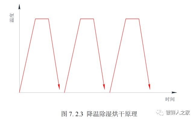 鑒于以上所述現(xiàn)有技術(shù)的缺點(diǎn),本發(fā)明的目的在于提供一種基于降溫除濕的退火爐烘干方法,用于解決現(xiàn)有技術(shù)中烘爐方法無(wú)法烘干設(shè)備外側(cè)耐材,進(jìn)而無(wú)法達(dá)到降溫除濕的目的等問(wèn)題。為實(shí)現(xiàn)上述目的及其他相關(guān)目的,改進(jìn)方法提供一種基于降溫除濕的退火爐烘干方法,包括如下步驟:A)向退火爐中通入保護(hù)氣體,然后依次進(jìn)行加熱升溫、保溫;B) 保溫結(jié)束后,繼續(xù)通入保護(hù)氣體,使退火爐降溫冷卻;重復(fù)步驟A)和B)至退火爐內(nèi)露點(diǎn)保持穩(wěn)定,且達(dá)到設(shè)計(jì)規(guī)定的露點(diǎn)范圍時(shí),烘爐結(jié)束。上述各步驟采用加熱—保溫—冷卻工藝循環(huán),在冷卻降溫過(guò)程中實(shí)現(xiàn)退火爐隔熱材料中的水汽、氧氣排出,置換成干燥的保護(hù)氣體。根據(jù)實(shí)際需要,循環(huán)的次數(shù)可以是2次、3次、4次、5次或者更多。如上所述,改進(jìn)的一種基于降溫除濕的退火爐烘干方法,至少具有以下有益效果:采用降溫除濕原理對(duì)新建退火爐或?qū)﹂L(zhǎng)期停爐暴露在空氣中的退火爐烘干的方法,能夠使得退火爐的隔熱材料烘透、烘干,在隨后的生產(chǎn)過(guò)程中,爐膛內(nèi)的氣體中的水蒸氣含量穩(wěn)定處于工藝規(guī)定的范圍內(nèi),確保產(chǎn)品質(zhì)量的穩(wěn)定。