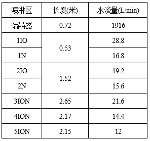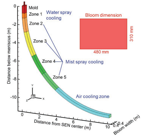目前軸承鋼的生產工藝路線是堿性氧氣轉爐(BOF)→鋼包精煉爐(LF)→真空脫氣(VD)→連鑄CC→軋制。在轉爐的出鋼期間,添加鋁合金到鋼水包中沉淀脫氧,添加SiFe合金到渣面上進行擴散脫氧,以此來降低鋼中的溶解氧到ppm的水平上來,最終在穩態連鑄條件下的鋼水中的全氧含量約為5 ppm。鑄坯的斷面幾何尺寸為310 mm × 480 mm,拉速為0.51 m/min,中間包鋼水溫度為1 753 K,此鋼種的液相線為1728 K,固相線為1602 K。連鑄機冷卻段有5個二冷控制區和一段空冷區,如圖1所示。足輥區為水噴嘴冷卻,由兩段水路控制,其余四個區采用氣水霧化噴嘴冷卻,然后是空冷,各冷卻區長度和水流量見表1。