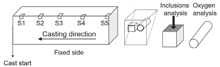 軸承鋼的超高性能的日益增長的需求要求嚴格控制鋼中的非金屬夾雜物。[1~6]對軸承鋼中夾雜物在煉鋼初煉[7]、精煉[8,9]、鈣處理[10]、連鑄[11]和電渣重熔[12,13]過程中的演變和轉變進行了大量的研究,以及少量在鋼的冷卻和凝固過程中夾雜物成分轉變的研究。[14,15]最近一些年來,鋼中夾雜物的瞬態演化調研吸引了大量關注,使用動力學模型來預測了在精煉過程中鋼水夾雜物成分上的變化,[16~27] ,以及在在鑄坯加熱過程中的變化。[26~32]使用流體流動,熱傳遞和凝固,鋼中夾雜物的碰撞和運動,對連鑄坯橫截面上的夾雜物的空間分布和尺寸大小進行預報,[31,33~35] 作者預報了在重軌鋼鑄坯中夾雜物在空間上的分布,[36]然而,估計軸承鋼的夾雜物成分的空間分布少有報道,這恰恰是對鑄坯產品的夾雜物的精確控制非常重要。