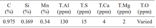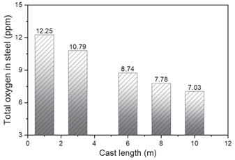 圖3顯示了頭坯試樣的T.O,連鑄開澆時,連鑄開澆起步的時候,由于鋼水的二次氧化造成全氧含量高達12ppm,然后隨著鑄坯長度的增加,鋼中的T.O含量逐漸降低,當鑄坯長度為10 m時,T.O含量約為7ppm。起步開澆時候的高全氧含量是非穩態澆鑄導致的,反映在鋼液的二次氧化。由于連鑄機中間包和結晶器在澆注前都充滿了空氣,所以在澆注開始階段,鋼水與空氣充分結合,導致嚴重的二次氧化。隨著鑄坯長度的增加,澆鑄過程變得越來越穩定,反映在全氧含量上的減少,如圖3所示。鑄坯長度為10 m之后,全氧含量仍然在降低過程中,表明連鑄過程仍處于非穩態。