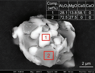 鑄坯中的夾雜物大多近乎球形,圖4為典型夾雜物的三維形態,該夾雜物是用無水溶液電解提取的,夾雜物直徑約為8 μm,由兩相交錯組成,灰色為多面體狀MgO·Al2O3尖晶石相,白色為光滑狀CaS相。