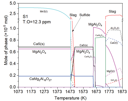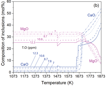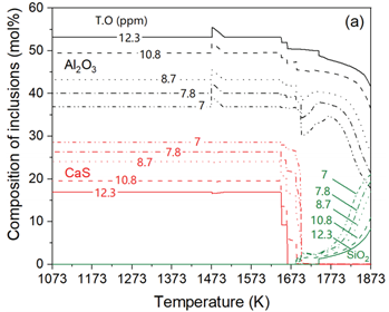 轉變夾雜物相進入到簡單的化合物,圖9給出了夾雜物中Al2O3、MgO、CaO、SiO2和CaS的平衡含量,隨著溫度從1 873 K降低到1673 K,夾雜物中CaO和SiO2的平均含量顯著降低,同時,Al2O3、MgO、CaS含量上升,夾雜物由CaO-Al2O3-SiO2-MgO變為CaS - Al2O3 - MgO。然而,隨著全氧含量的降低,隨著溫度的降低,夾雜物中Al2O3含量顯著降低,而MgO和CaS含量顯著升高。在高溫條件下,CaO含量隨全氧增加而降低,在低溫條件下,CaO含量隨全氧增加而略有增加。SiO2僅在高溫條件下穩定,在低溫條件下幾乎沒有SiO2,這與工業實驗結果一致。