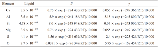 表3 Ca、Al、Si、Mg、S和O在液相、δ相和γ相中的擴散系數(m2/ S) [38 –40]