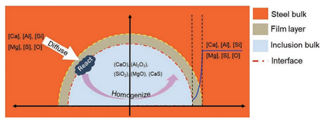 根據元素在鋼中的擴散建立動力學模型,動力學機理如圖10所示。該相變過程分為三個步驟:(1)夾雜物周圍溫度隨連鑄坯冷卻而變化;(2)新的熱力學平衡取代了原來的熱力學平衡,導致界面與鋼基體之間存在濃度梯度;(3) Ca、Al、Si、Mg、S、O等元素在鋼的肌體與鋼-夾雜界面之間的擴散速率由式(1)計算。