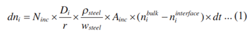 這里的ni為元素i (Al, Si, Mg, Ca, S, O)在鋼基體中的摩爾量;Ninc是夾雜物的數量;Di為元素i的擴散系數,m2/s,如表3所示;[38-40] r為夾雜物半徑,m;ρ鋼為鋼的密度,kg/m3;wsteel是鋼的重量,kg;Ainc為界面面積,m2;dt為時間間隔,s。上標體表示鋼基體,界面表示鋼-夾雜物界面。