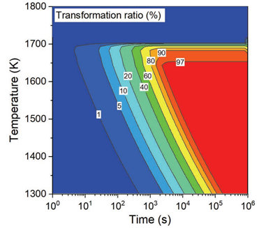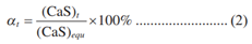 人們普遍認為冷卻速率對連鑄坯的微觀組織起著至關重要的作用,TTT和CCT曲線對這一現象進行了描述。在本研究中,利用TTT和CCT曲線來研究鋼冷卻過程中夾雜物成分的轉變。對于當前設計鋼種,在鋼冷卻過程中發生的主要反應是CaO向CaS的轉化,該反應的轉化率定義如下: