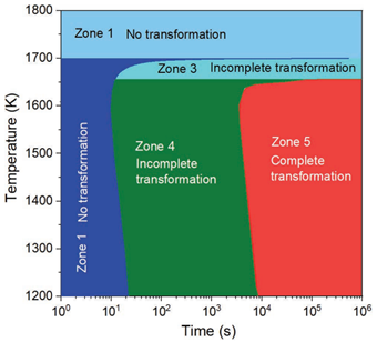 利用TTT圖輪廓定量評價轉變比例,如圖15所示。當溫度高于1700 K時,夾雜物的成分沒有發生轉變,這與熱力學分析一致。當溫度低于1700k時,相變率隨反應時間的增加而增加,且較低溫度下的相變明顯滯后于較高溫度下的相變。圖15可以用來精確地控制在恒溫加熱和保溫過程中鑄坯中夾雜物的組成。例如,一旦給出了夾雜物中CaS的目標含量,就可以得到在一定溫度下鑄坯的保溫時間。如果1%的轉換比率被定義為轉換的開始和完成一個轉化率為97%,整個區域被劃分為5個典型的子區域,稱為“非轉變區”,“不完全轉變區”,和“完全轉變區”,如圖16所示。非轉變的1區和不完全轉變的3區受熱力學約束,第2區和第4區主要受動力學約束。