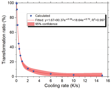 當夾雜物中Al2O3,MgO和SiO2在鋼的冷卻過程中根本不參與轉變反應,公式(2)中的α用于估算相變程度。圖18表明公式(3)中相變率與冷卻速率之間的回歸關系