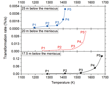 對比圖21、22和23,可以發現相變速率與冷卻速率的相關性并不明顯,最大TR出現在相同溫度下約1700 K,這是CaO向CaS的初始相變溫度。Tr與溫度有很強的相關性。圖24顯示了從內弧一側到鑄坯中心的5個位置的TR,從彎月面對應的三個鑄坯長度,TR值隨溫度升高而增大,說明在低于CaS初始轉變溫度的條件下,鋼中溫度較高部位夾雜物的轉變速度較快。如果要求夾雜物的相變比大,則在CaS初始相變溫度以下的高溫停留時間越長越好。因此,相變比例由冷卻速率決定,相變速率由溫度決定。