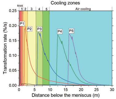 利用這5個位置的熱履歷,用公式(4)計算夾雜物的成分轉變比和轉變速率,分別如圖22和圖23所示。在冷卻過程中,夾雜物在鑄坯四分之一厚度的P3位置的轉變率最高,而在P1位置的成分轉變較小。夾雜物的最大相變速率隨空間位置的變化而變化,并逐漸從結晶器區向空冷區移動。內弧夾雜物的成分只在結晶器一冷過程發生變化,而靠近鑄坯中心的夾雜物的成分只在空冷區發生變化。P3位置夾雜物的成分轉變是從3區二冷冷卻區開始的,這是夾雜物轉變的最佳條件。