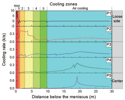圖21 計算冷卻速度在5個位置與間隔距離從內弧一邊到鑄坯的中心