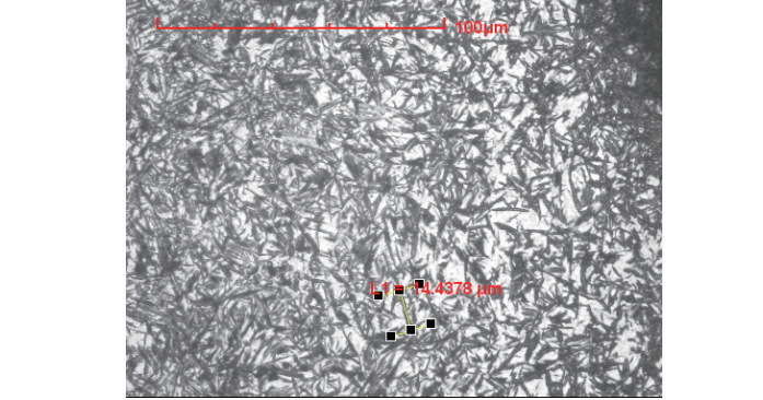 該零件技術(shù)要求:表面硬度57~62HRC,心部硬度30~45HRC,有效硬化層深度為0.6~0.9mm。該聯(lián)動軸表面硬度59~60HRC,心部硬度35~37HRC,有效硬化層深度為0.79mm,符合技術(shù)要求。該零件熱處理金相組織要求:表層回火馬氏體≤5級,殘留奧氏體≤5級,碳化物≤3級。如圖2所示,該聯(lián)動軸表層回火馬氏體為5級,殘留奧氏體為5級,碳化物為1級,符合技術(shù)要求。對斷口處進行非金屬夾雜物的檢測(見圖3)測試結(jié)果:A1.0,B3.0,C0.5,D3.0,DS0.5,發(fā)現(xiàn)斷口附近有大量B類、D類非金屬夾雜物。