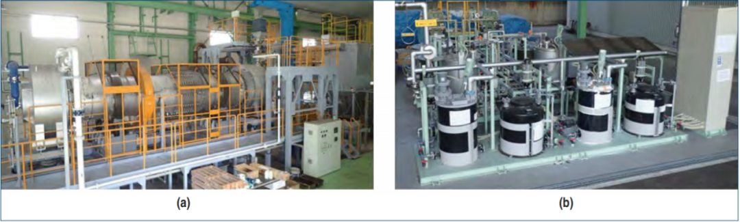 3為步驟1的實(shí)驗(yàn)規(guī)?;剞D(zhuǎn)窯(1/)和步驟2洗滌工藝去除鹵素和重金屬(0.5/)的反應(yīng)器圖片。