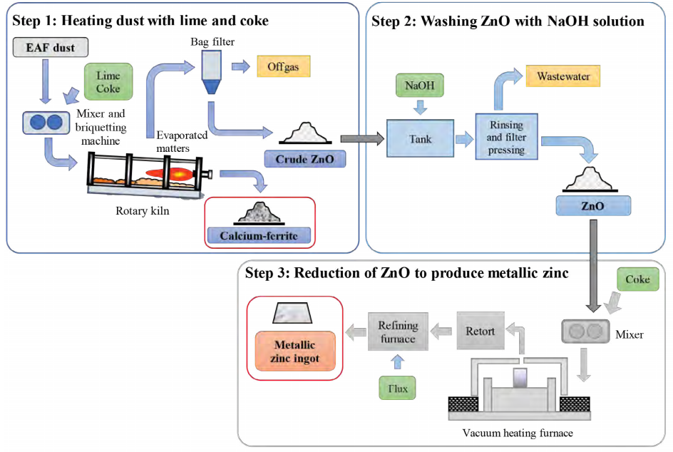 (圖第一列上:步驟1,加熱電爐粉塵和石灰以及焦炭;步驟2:使用NaOH溶液洗滌ZnO;步驟3ZnO還原為金屬鋅。第三列:上方框內(nèi)容旋轉(zhuǎn)窯,中間是箱體,下方框是真空加熱和精煉爐,第四列:上方框文字熟料(鐵酸鈣),中圖框文字是鹵素元素和重金屬,下圖框文字是過(guò)量碳,金屬鋅錠。)
