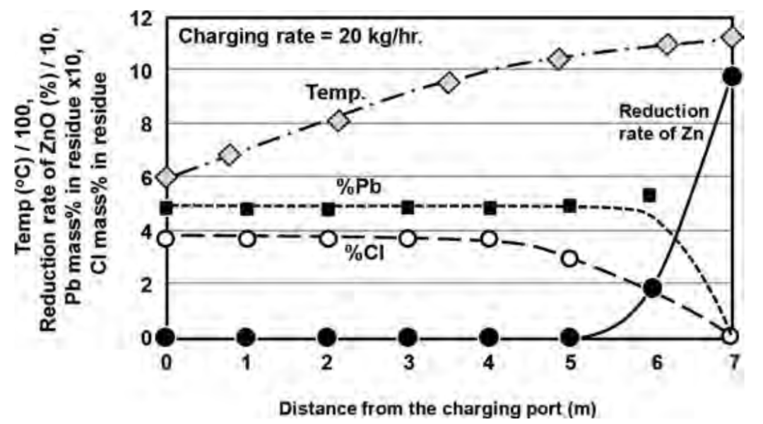4為爐料溫度、ZnOClPb含量隨窯內(nèi)距離的變化規(guī)律。原料從爐子的右側(cè)加入,在移送過(guò)程中在爐內(nèi)逐漸加熱,,當(dāng)溫度低于1000℃時(shí),ZnO Cl、Pb氣化現(xiàn)象明顯下降,觀察不到反應(yīng)。當(dāng)在燒嘴火焰下達(dá)到最高溫度時(shí),大部分鋅被還原和蒸發(fā),ClPb也被蒸發(fā)并從靠近燒嘴火焰附近的固體殘留物中去除。
