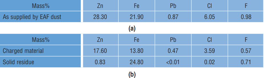 Tsubone等和Drissen等報(bào)道,粉塵噴射技術(shù)在降低電弧爐粉塵總量和增加鋅含量方面是有效的。[15,26]這項(xiàng)技術(shù)最大的優(yōu)點(diǎn)是減少了粉塵總量,降低了成本。另一方面,它也有一些缺點(diǎn):噴吹的粉塵中鐵大部分流失到渣相,渣的體積增大,再生粉塵中鹵素含量遠(yuǎn)高于常規(guī)粉塵,且電爐車間產(chǎn)生的粉塵中鋅的總量是不變的,說(shuō)明噴塵技術(shù)只是電爐粉塵處理的輔助手段。