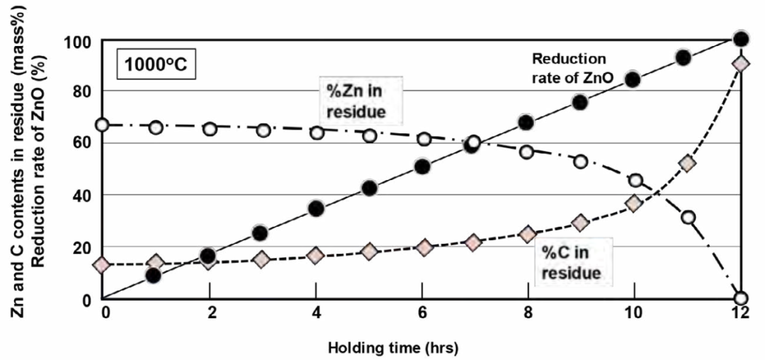 還原行為從廢氣組成和試樣中估計(jì),如圖7所示。如圖所示,還原反應(yīng)在12小時(shí)內(nèi)完成。從焦炭和氧化鋅的質(zhì)量平衡推導(dǎo)出方程23的反應(yīng)都消耗了碳,說(shuō)明還原過(guò)程中碳的利用效率很高。