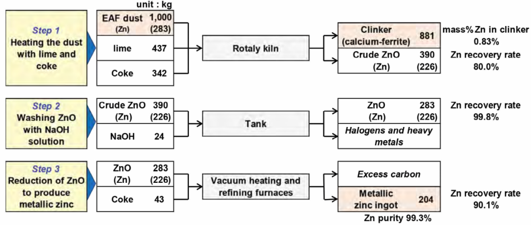 首先,CaO和焦炭加入到電弧爐粉塵里,在回轉(zhuǎn)窯加熱到1100°C,在這里鐵酸鋅轉(zhuǎn)換為氧化鋅和鐵酸鈣,氧化鋅還原為鋅蒸氣(步驟1)。鋅蒸氣隨后再次在爐內(nèi)的低溫區(qū)氧化,在布袋除塵器中收集。粉塵中Cl、F等鹵素以及以Pb為主的重金屬在加熱過(guò)程中也會(huì)蒸發(fā)并沉積在布袋除塵器中。收集到的粗氧化鋅含有鹵素和Pb,因此采用基于濕法冶金技術(shù)的水洗工藝,用NaOH溶液去除雜質(zhì)(步驟2)。精制氧化鋅在減壓的條件下進(jìn)行碳熱還原反應(yīng)以獲得金屬鋅。殘?jiān)饕沁^(guò)量的焦炭(步驟3)。