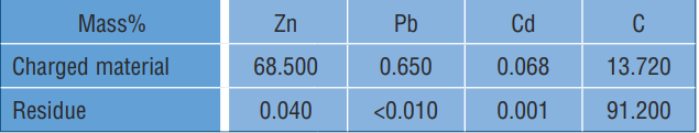 步驟3前后固體材料組成匯總見表3。初始物料中的氧化鋅大部分被還原蒸發(fā),還原后的固體殘?jiān)旧鲜俏捶磻?yīng)的過(guò)量碳,可以在下一次加入物料時(shí)候重復(fù)使用。