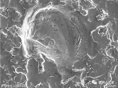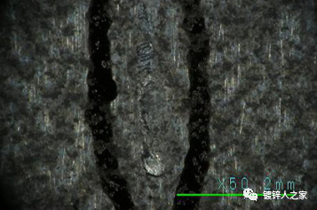 麻點主要出現在帶鋼的邊部,平行于生產線的軋制方向排列,呈凹陷、圓滑的界面形貌,也有一定的方向性,在帶鋼的長度方向上呈彗星狀,直徑為20~30um 左右。可見這種麻點是由于異物硌傷造成的。