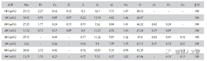 可見結瘤物質成分比較復雜,不同區域成分差異很大,但總體上主要成分有Mn、Si、Al、Fe、Na、Cr、O 元素。這些元素中,如此高的Mn只可能來自帶鋼的合金成分。其它的Na可能來自前處理,Cr可能來自爐輥,Si、Al可能來自爐內耐火材料以外,但即便如此,還是來自帶鋼合金成分的可能性比較大。因此,雖然有多種因素可能造成爐輥結瘤,但本案例還是以帶鋼的合金成分為主。