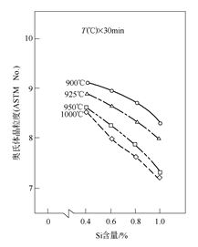 通過TMCP工藝最終獲得微細的組織,進而獲得良好的綜合性能,這是諸多影響因素的最佳集成,不是某個單一因素造成的,這些影響因素主要有鋼的化學成分(包括主要合金元素和微合金化元素)、再加熱溫度、軋制工藝參數(shù)(壓下量和終軋溫度)和冷卻參數(shù)(加速冷卻速率和終止冷卻溫度)等。 鋼的化學成分中主要合金元素對奧氏體晶粒尺寸的影響是比較復雜的,它隨鋼的冶煉方法、凝固方法、微量元素、熱軋條件和熱履歷的不同而有較大的差異。但是根據(jù)α/γ的相變特點概括地說,可以把合金元素分成兩類:1)降低相變點Ac3的元素C、Mn、Ni、Cr等和碳化物生成元素C、Cr、Mo;2)顯著提高相變點的元素Si。添加降低相變點元素和碳化物生成元素有利于使鋼的奧氏體晶粒尺寸減小,添加提高相變點的元素對鋼奧氏體晶粒的細化是不利的。這里應特別指出,Si是不形成碳化物的元素,它能大幅度提高相變點Ac1和Ac3,當Si含量高于0.2%時,奧氏體晶粒顯著粗化,如圖1所示。 圖1 Si含量對奧氏體晶粒度的影響 ((900~1000)℃×30min,WQ,1%Cr-0.5%Mo鋼) 鋼的化學成分中的Nb、V、Ti、Al、Zr等微合金化元素,對奧氏體晶粒度的影響主要有兩種方式:一種是在奧氏體中析出的M(C,N)對晶界起釘扎作用;一種是固溶在奧氏體中的溶質原子起拖曳作用。從溫度區(qū)間方面看,在高溫區(qū)以固溶拖曳作用為主,在低溫區(qū)則以析出釘扎作用為主。 微合金化元素除通過形成碳氮化物抑制奧氏體再結晶外,同時還能阻礙再結晶后的晶界移動和晶粒長大,提高再結晶奧氏體晶粒的粗化溫度,在微合金化元素Nb、Ti、V中,以Ti的作用最顯著。 在鋼坯的再加熱過程中,加熱溫度是一個很重要的工藝參數(shù)。加熱溫度的選擇,應以加入鋼中的微合金化元素是否能全部或絕大部分溶解到奧氏體中為依據(jù)。如果再加熱溫度過高,雖然微合金化元素都能溶解,但原始奧氏體晶粒會過于粗大,這對最終的組織細化不利,可能導致鋼的韌性降低,轉變溫度升高,所以對韌性要求比較高的低合金鋼,如低溫鋼,高韌性低合金結構鋼,要求較高韌性的長形鋼材等,為提高低溫韌性通常都采用較低的再加熱溫度;如果再加熱溫度過低,加入鋼中的微合金化元素不能全部固溶到奧氏體中,降低了軋制冷卻后的析出強化效果,沒充分發(fā)揮微合金化元素的作用,如V-Ti-N微合金鋼,加熱溫度從1250℃降至1100℃時,屈服強度雖降低40MPa,但韌性卻提高了,韌脆轉變溫度降低約15℃。根據(jù)實踐經(jīng)驗和理論計算,含鈮鋼的再加熱溫度應不低于1200℃,含釩鋼的再加熱溫度應不低于1100℃。 軋制工藝主要有兩種方法:一種是在奧氏體再結晶區(qū)的再結晶控制軋制;另一種是在奧氏體未再結晶區(qū)控制軋制。還有一種是在奧氏體和鐵素體兩相區(qū)軋制,但應用較少。再結晶控制軋制比較適用于含釩的微合金鋼,最佳的成分是V-Ti-N合金系。奧氏體未再結晶區(qū)控制軋制比較適用于含鈮的微合金鋼。在奧氏體和鐵素體兩相區(qū)軋制時,未相變的形變奧氏體被繼續(xù)拉長,在晶內形成形變帶,提高位錯密度,促進進一步形成很細的等軸鐵素體,先前析出的鐵素體也將產(chǎn)生塑性變形,在晶粒內部形成大量的位錯及亞結構,提高鋼的綜合性能。目前,采用兩相區(qū)軋制的工藝方法應用還比較少。 終軋溫度對奧氏體的再結晶有較大影響。鋼的奧氏體再結晶區(qū)溫度通常不低于950℃,因此,再結晶控制軋制一般在950℃以上的溫度下進行。當終軋溫度低于950℃時,奧氏體就不能完全再結晶,有試驗結果表明,當終軋溫度為905℃時再結晶分數(shù)可達50%,終軋溫度為875℃時再結晶分數(shù)只有20%。在熱軋條件下,V-Ti-N系微合金鋼通過900~1000℃的再結晶控制軋制,可產(chǎn)生明顯的組織細化。在奧氏體溫度區(qū)軋制時,通常是終軋溫度越低,晶粒就越細,強度和韌性都會提高,如圖2和圖3所示。圖2的結果表明,終軋溫度是TMCP的一個重要工藝參數(shù),它對材料的強度和韌性都有很大影響,但是由于微合金鋼的成分體系不同,終軋溫度對微觀組織和力學性能的影響也不同。在Ti-V(Nb)-N鋼的情況下,當終軋溫度接近Ar3時,鋼的低溫韌性(如50%FATT) 和強度獲得了良好的配合,然而,當采用再結晶控制軋制,終軋溫度為950℃時,也同樣獲得了良好的強度與韌性的匹配。這表明在Ti-V(Nb)-N微合金鋼的情況下,終軋溫度對鋼的力學性能幾乎沒有影響,為提高生產(chǎn)效率和產(chǎn)品的穩(wěn)定性創(chuàng)造了十分有利的條件。Chilton和Roberts對V-N微合金鋼的研究也獲得了相同的結果。 圖2 終軋溫度對Ti-V(Nb)-N鋼力學性能的影響 a-強度;b-沖擊韌性 Treh-再加熱溫度;ACC-加速冷卻速度;FACT-加速冷卻終止溫度 圖3 終軋溫度(1030℃)到終冷溫度(FCT)的冷卻速率對Ti-V(Nb)-N鋼組織和性能的影響 a-鐵素體晶粒尺寸;b-屈服強度;c-沖擊韌性 終軋后的冷卻速度和加速冷卻終止溫度對材料的顯微組織和綜合力學性能有強烈的影響。 終軋后的冷卻速度越快,使材料通過相變溫度區(qū)的速度加快,過冷度增大;終軋后的冷卻速度對γ→α的相變溫度有顯著影響,冷卻速度越快,導致γ→α的相變溫度降低,鐵素體的形核率提高,鐵素體晶粒的長大速率降低,使鐵素體晶粒細化。當終軋后的冷卻速度過快時,盡管鐵素體晶粒得到了細化,但鋼的綜合性能不能明顯提高。 在一般情況下,若冷卻速度增大,則過冷度增加,形核