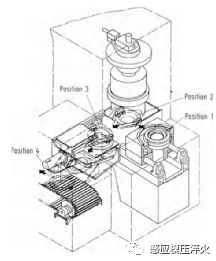 設(shè)計用于相對高產(chǎn)量的自動壓床(圖 10.2.6),也是利用脈沖原理。在這個特定的工藝中,將熾熱的齒輪放置在機器前面(位置1)的擴展下模上。然后,下模和工件移動到淬火室的中心(位置2)。上部機構(gòu)(包括壓環(huán)和擴展錐)向下移動接觸工件和下模擴展機構(gòu),然后關(guān)閉淬火室門。接著淬火油的脈動和流動(約757升/分鐘,或 200 加侖/分鐘)持續(xù)大約 20 秒。按照這個預(yù)定的時間間隔,脈沖停止,上模上升。輔助淬火室的門打開,讓它充滿油。然后卸料器的鉗口將工件從下模轉(zhuǎn)移到輔助淬火室(位置 3)進一步冷卻。然后淬火室門關(guān)閉,密封輔助淬火室。